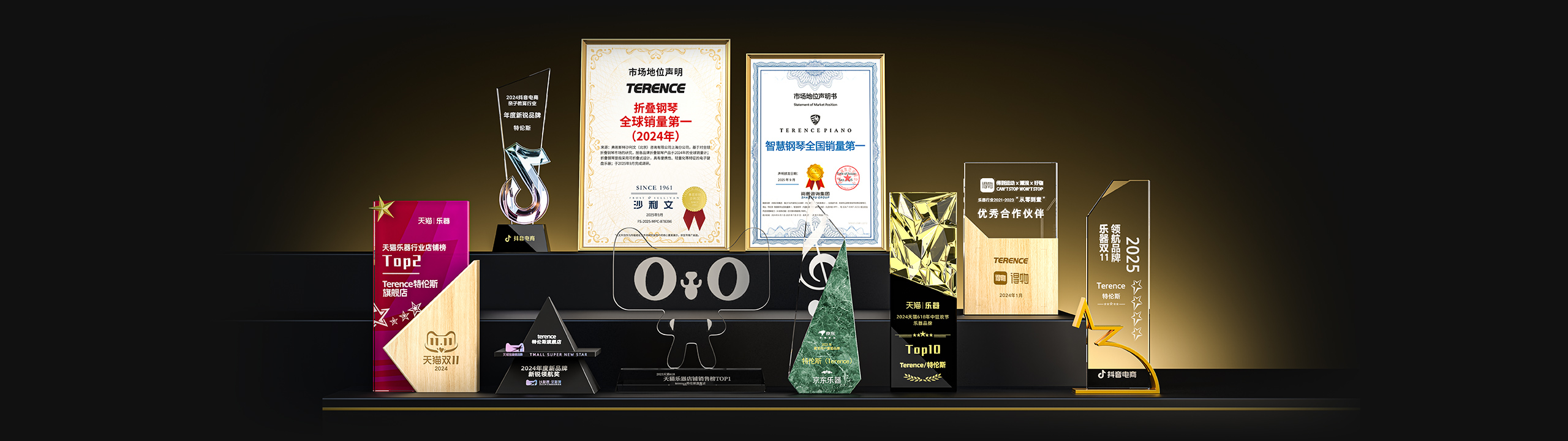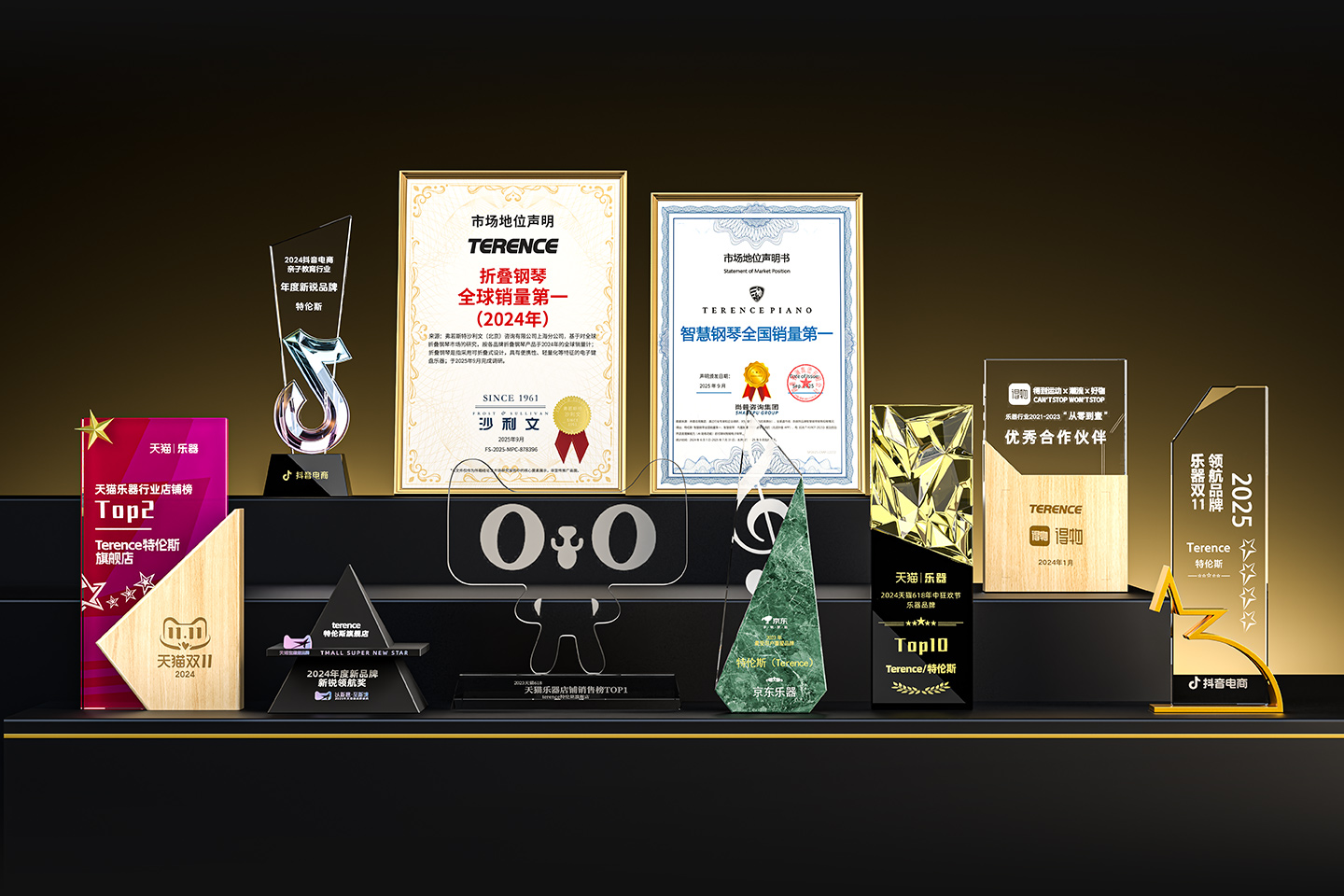 特倫斯創(chuàng)新科技榮獲:折疊鋼琴全球銷量第一(2024年)[1]、智慧鋼琴全國(guó)銷量第一[2]、2025年天貓618樂(lè)器設(shè)備店鋪榜TOP2、2025年天貓雙11樂(lè)器店鋪榜TOP1、2025年天貓雙11樂(lè)器品牌榜TOP3、2022年天貓樂(lè)器行業(yè)TOP1、2023年天貓618樂(lè)器行業(yè)TOP1、2024抖音電商年度新銳品牌、2024天貓樂(lè)器店鋪TOP2、2024天貓年度新品牌新銳領(lǐng)航獎(jiǎng)、2023年京東最受用戶喜愛(ài)品牌等獎(jiǎng)項(xiàng);
